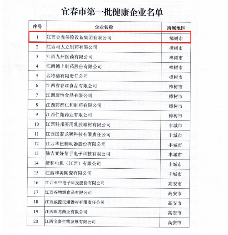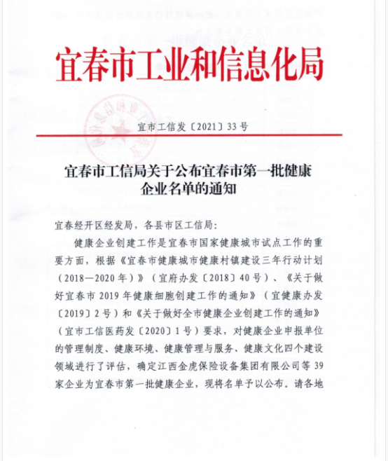 近年来,公司在企业管理制度、绿化程度、卫生环境、食堂管理、企业文化、文体活动、职业病防护措施、健康宣传等健康促进措施有亮点、有特色。经宜春市工信局对公司管理制度、健康环境、健康管理与服务、健康文化四个建设领域评估,公司被确定为宜春市第一批健康企业。